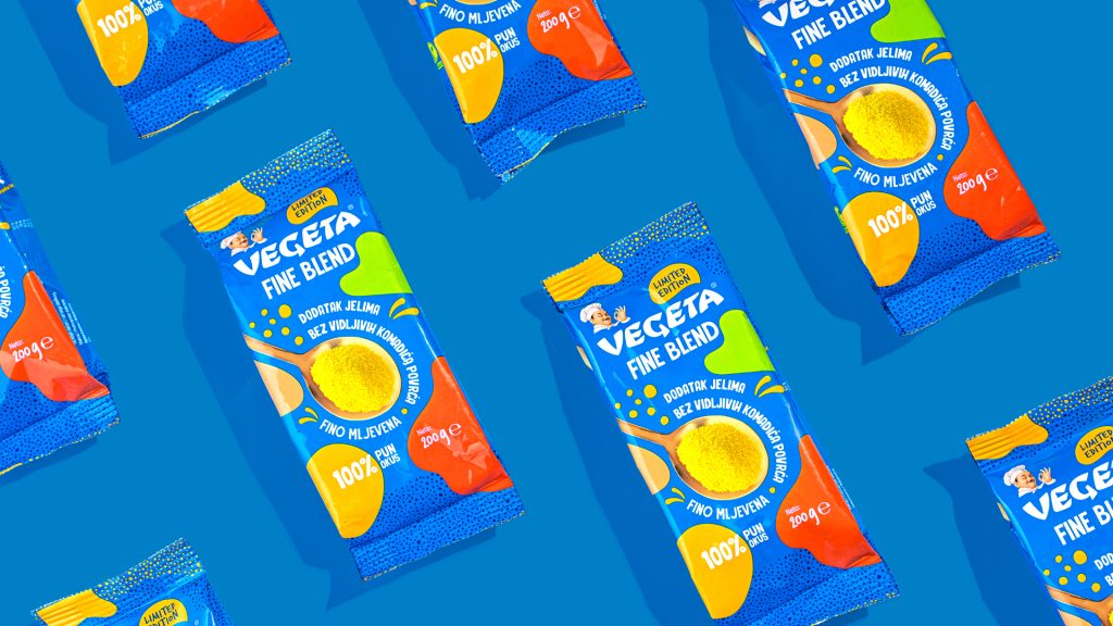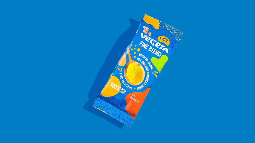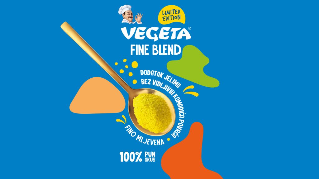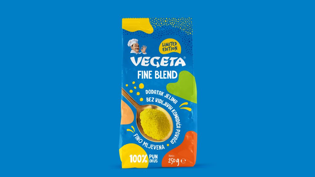 Fine Blend kratko je i svima razumljivo ime koje jasno govori da se radi o ukusnoj, fino mljevenoj mješavini začina. U dizajnu ambalaže koristili smo prepoznatljivu, plavu boju Vegete i dodali sitne točkice koje dočaravaju sipkost i finoću proizvoda. Sve smo začinili živahnim amorfnim oblicima jarkih boja i zaigranom tipografijom i na kraju dodali - jednu žlicu Vegete.